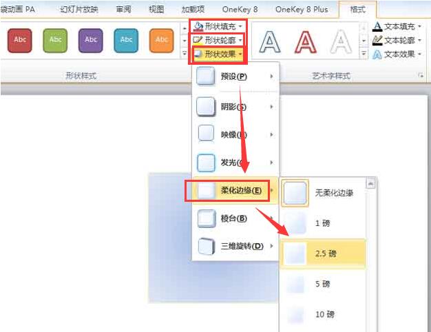 2、设置形状填充为自己喜欢的一种渐变颜色,形状轮廓为黄色,形状效果为柔化边缘2.5磅。