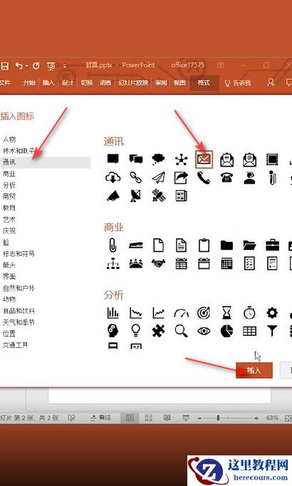 5、在图标界面点击“通讯”,选择“信封”图标,点击“插入”。