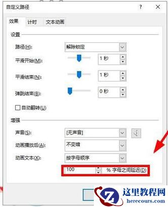 6、出现”自定义路径“对话框,在”效果“这一项下,选择”动画文本“”按字母顺序“。”按字母顺序“设置完之后,下面出现”%字母之间延迟“,我们设置为100%。