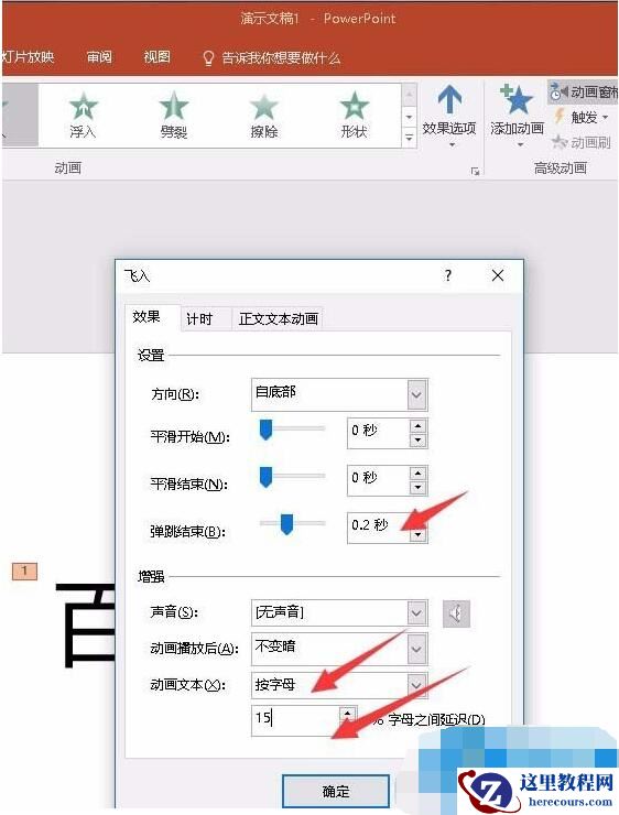 六、在【飞入】的效果选项中:弹跳结束:输入0.2秒,动画文本:选择【按字母】,输入15%字母之间延迟,确定。
