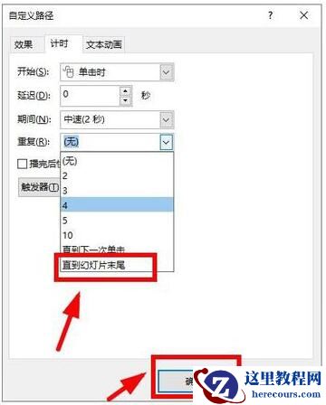7、在”计时“这一项,选择“重复”下的”直至幻灯片末尾“,不要忘了点击”确定“。