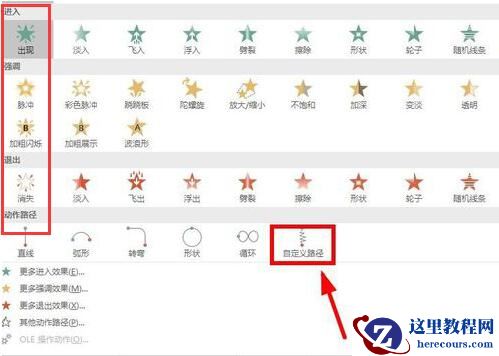 3、 出现众多动画的路径形式,选择”动作路径“的”自定义路径“。
