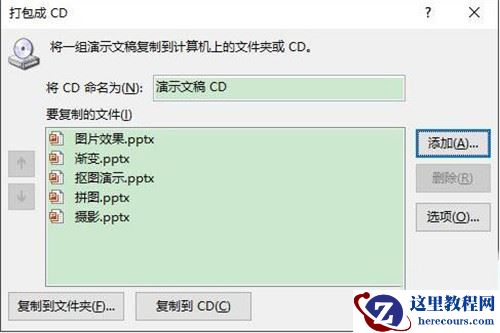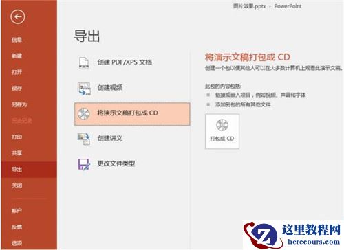 首先打开一个制作好的PPT,然后点击“文件→导出→将演示文稿打包成CD”,再点击右侧“打包成CD”按钮。