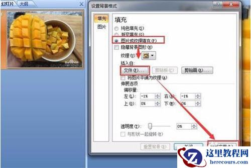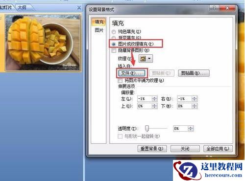 选中图片或纹理填充选项后,下方就出现了插入自,下方有个文件按钮,点击文件就可以上传我们的ppt背景图片了。