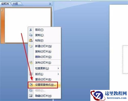 正确的方式是鼠标移动到左侧的幻灯片上,然后鼠标右键选择设置背景格式选项,也可以通过右侧的页面右键也是一样的。