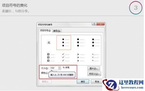 细心的小伙伴应该发现了颜色上面的一个选项:大小。是的,我们可以根据需要改变项目符号的大小,人性化的是,不仅可以变小,还可以变大。