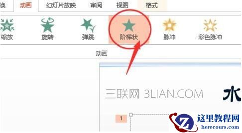 在选择好了动画之后,如阶梯状。再点击右边的‘动画窗格’这个选项,随即会在窗口的右边出现一个小窗口,用来设置一些格式的。