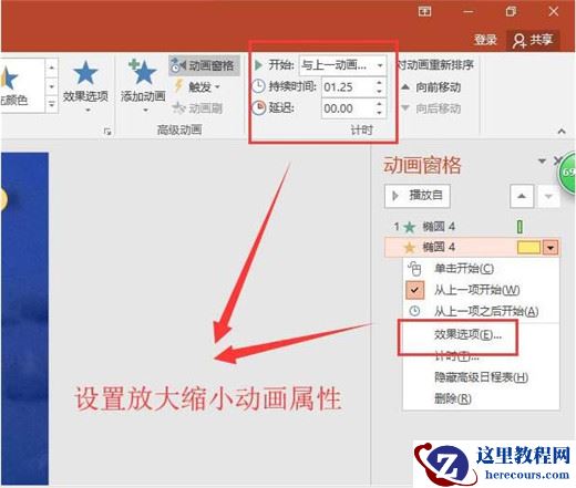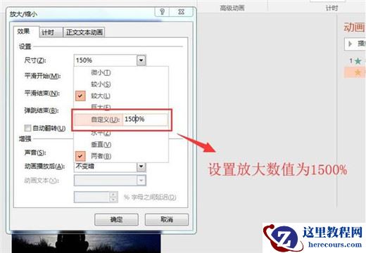 5、在动画窗格中选中添加的“放大/缩小”动画,设置开始为“与上一动画同时”,持续时间为1.25秒,然后右键鼠标选择“效果选项”,在弹出的效果设置窗口中设置尺寸为自定义1500%。