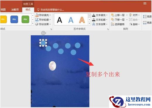 2、选中这个绘制的正圆,然后按住键盘上的Ctrl键,移动正圆得到一个复制圆,多次执行复制操作,得到多个正圆出来;然后在依次选中这些复制的正圆,依次更改其样式。