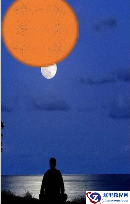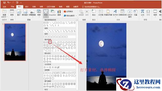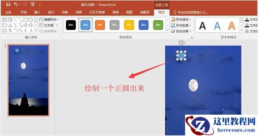 1、打开PPT演示文稿,并置入背景素材,然后在插入菜单中找到形状命令,选择椭圆形状;然后按住辅助键shift键然后在幻灯片上绘制一个大小合适的正圆出来。
