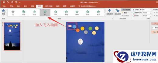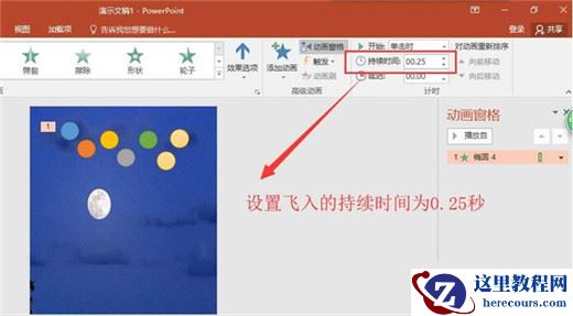 3、选中第一个正圆,切换到动画菜单栏中,为其添加一个飞入的动画效果;然后设置这个飞入动画效果的持续时间为0.25秒。