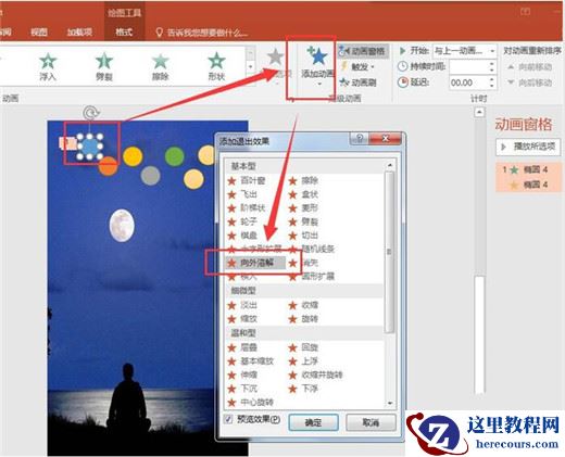 6、接下里再次为这个正圆添加第三个动画效果,在添加动画中选择“向外溶解”,设置“向外溶解”的效果为与上一动画同时,持续时间为1.25秒,延迟为0.25秒。