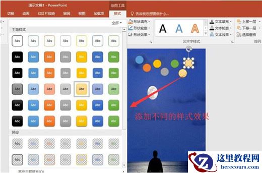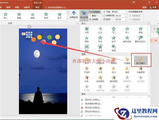 4、还是保持选中第一个正圆的状态,为其添加第二个动画效果,在动画菜单栏中找到添加动画,在添加动画中找到“放大/缩小”动画效果,点击添加。