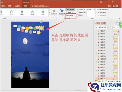 7、选中第一个正圆,然后双击“动画刷”命令,然后依次将第一个正圆的三个动画效果刷给其他的正圆。按F5播放幻灯片预览动画效果,这样,一个烟花绽放的动画效果就在PPT中做好了。