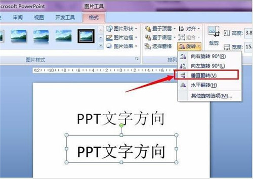 9、把图片插入之后,双击选中插入的图片,记得一定是双击这样会自动调出“格式”标签,找到“旋转”——“垂直旋转”,如下图所示: