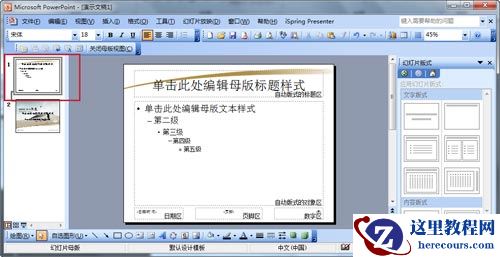 2、把开PPT母版视图后是否看到左侧有一张缩略图呢? 现在选中他,点击鼠标右键选择“新标题母版”,出现结果如下图所示: