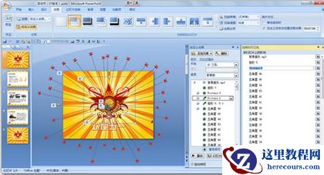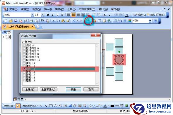 效果显示:如下图PPT中有13个元素,目前选中的对象是“椭圆13”,确定后“椭圆13”将被选中。PowerPoint 2003中的这个“选中多个对象”功能除了不能即刻可视化外,还不能修改元素名称,建议大家升级到PowerPoint 2010版本。