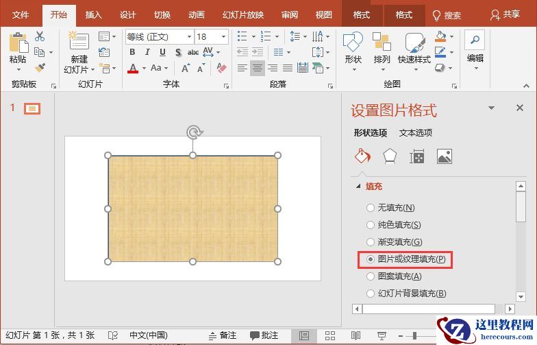 (2)选中绘制的矩形,右键,选择“设置形状格式”命令,在打开任务窗格的“填充”栏中选中“图片或纹理填充”单选按钮。