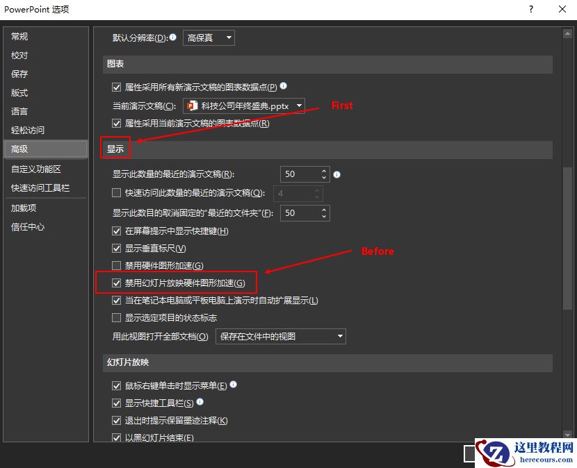 下滑找到“高级”菜单下面的“显示”选项,并勾选“禁用幻灯片放映硬件图形加速”选项