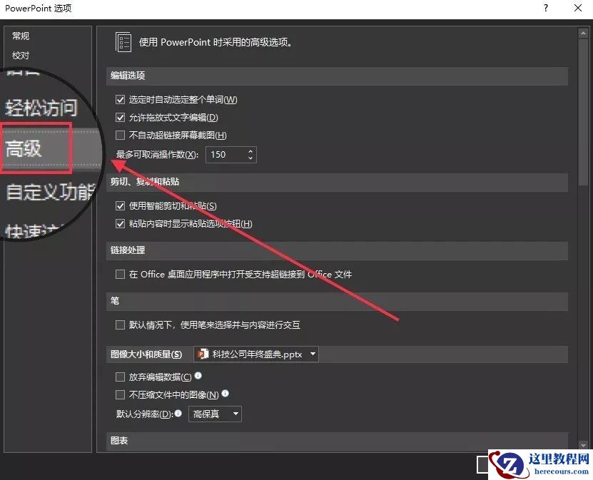 在“选项”中找到“高级”菜单