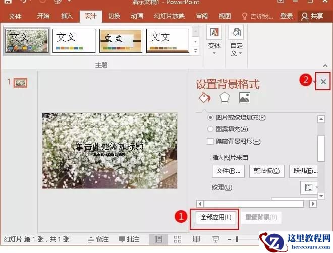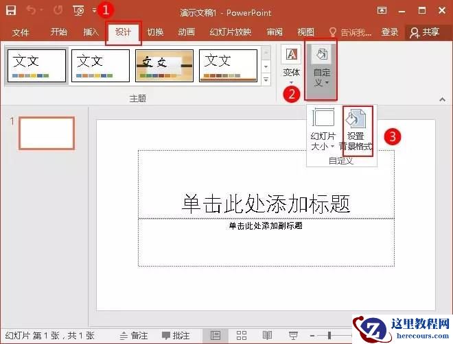 1、点击“设计”选项卡的“自定义”选项组,单击“设置背景格式”。