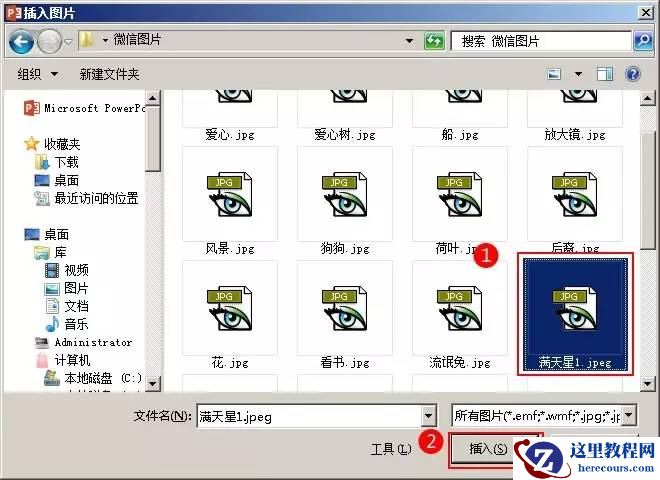 3、在“插入图片”对话框中,选中“满天星1”,再单击“插入”按钮。