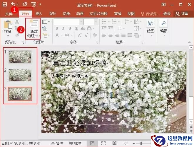 5、切换到“开始”选项卡的“幻灯片”选项组,点击“新建幻灯片”,可以所有幻灯片的背景图片都是一样的了。