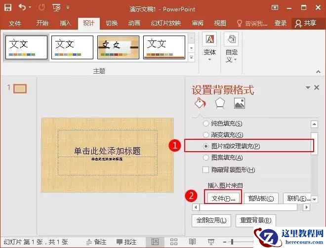 2、在“设置背景格式”窗格中,选择“图片或纹理填充”,再点击“文件”按钮。