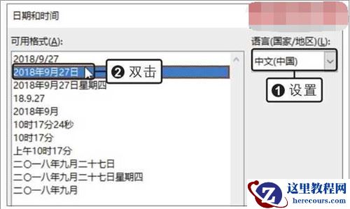 弹出“日期和时间”对话框,设置“语言(国家/地区)”为“中文(中国)”,在“可用格式”列表框中双击要选择的格式,如下图所示。