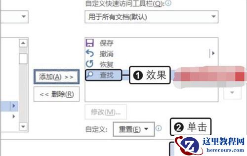打开“Word选项”对话框,在左侧单击“快速访问工具栏”选项,在右侧面板中的“从下列位置选择命令”列表框中单击“查找”选项,单击“添加”按钮,如下图所示。