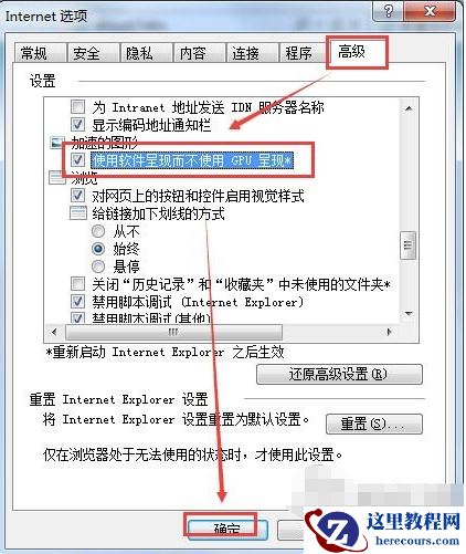 2、点击高级---将“加速的图形”下面的"使用软件呈现而不使用GPU呈现*”前面的选择框勾上,点击确定。