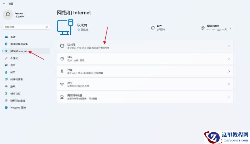 1、依次点击:开始菜单 - 设置 - 网络 - 以太网网,无线网的操作与有线网一致,此处以有线网络举例;