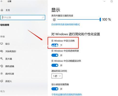2、在显示界面中找到【Windows中显示动画】关闭;