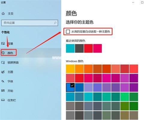5、在左栏中选择【颜色】选项,取消【从我的背景自动选取一种主题色】的勾选。