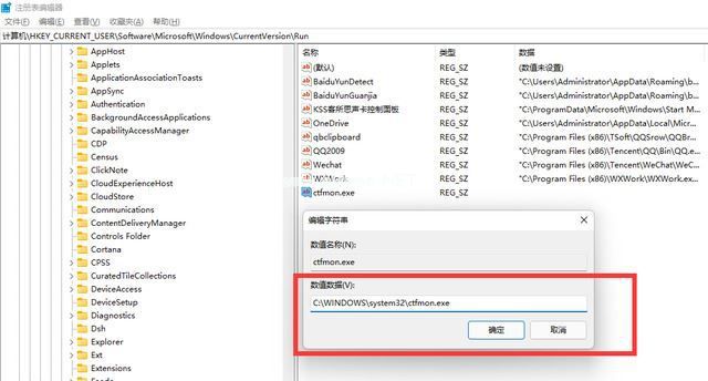 3.在Run层级中的右侧,找到“ctfmon.exe”键值,双击弹出编辑窗口,将其值设置为“C:\WINDOWS\system32\ctfmon.exe”然后点击确定。