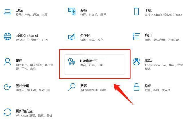 2.进入系统“设置”选项后,在弹出的界面里找到“时间和语言”选项: