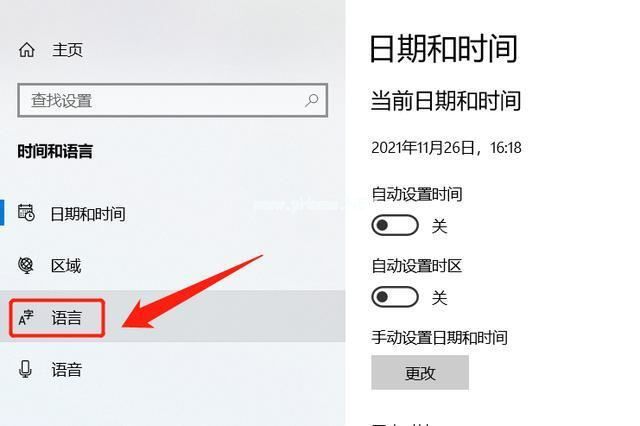 3.点击进入“时间和语言”选项,在弹出界面的左侧,找到“语言”:
