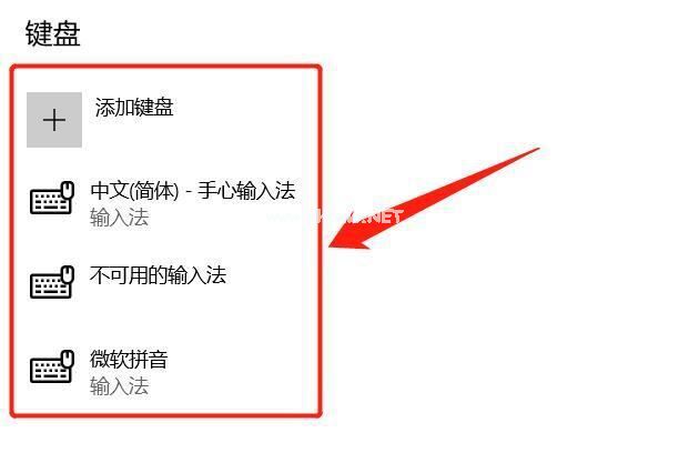 8.如果该选项内只有“微软输入法”,那么就是输入法丢失造成的,随便下载一个输入法,安装完成后,点击添加键盘,将输入法添加进来即可。