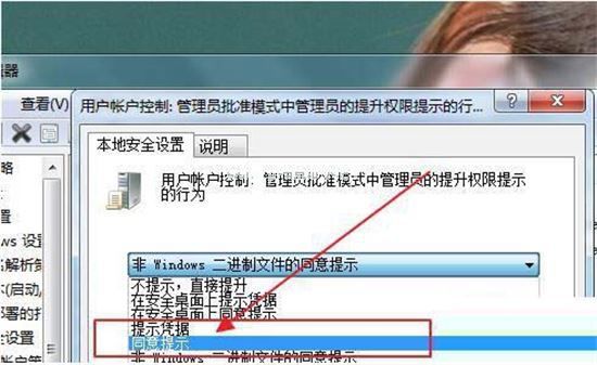 5、在这里是本地安全设置,我们把“非windows二进制文件的同意提示”改为“同意提示”。