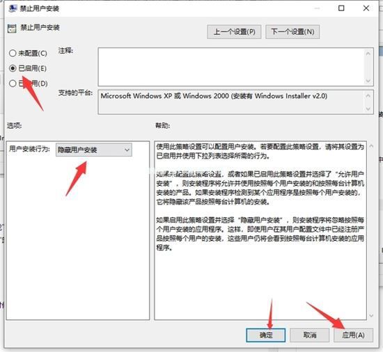 4、最后双击打开【禁止用户安装】窗口,将【未配置】改为【已启用】,在下方【用户安装行为】后面,选择【隐藏用户安装】,别忘了点击确定哦。