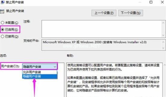 3、选择启用并“隐藏用户安装”,电脑就不会自动下载乱七八糟的软件了。