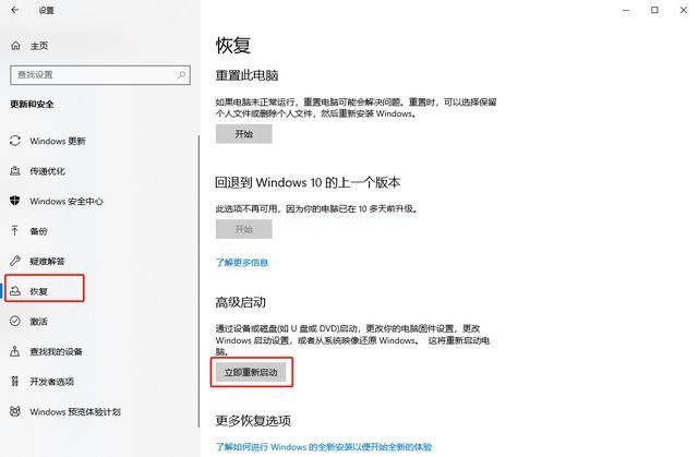 2. 左侧选择恢复。在右侧“高级启动”部分,单击“立即重新启动”。然后系统将重启。