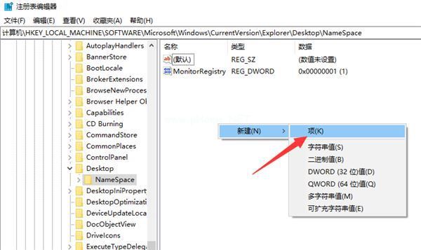 2、打开注册表编辑器,依次展开【HKEY_LOCAL_MACHINE】→【SOFTWARE】→【Microsoft】→【Windows】→【CurrentVersion】→【Explorer】→【DeskTop】→【NameSpace】。然后右击右侧空白处,新建项;