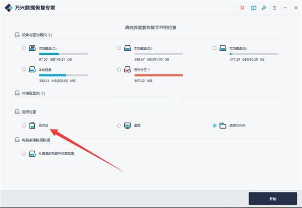 1、下载一款数据恢复软件,比如万兴数据恢复专家。下载完成后将其打开,选择位置选择回收站,点击右下角的开始;