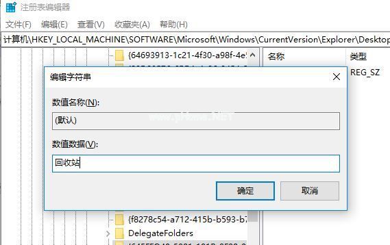 6、弹出编辑字符串窗口,数值数据修改为回收站,点击确定。重启电脑即可。