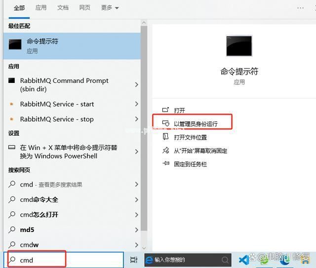 在Windows搜索框中输入命令提示符或cmd,右键单击命令提示符并以管理员身份运行。