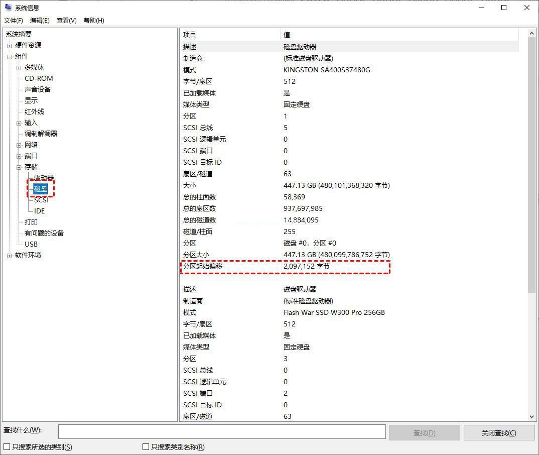 了解对齐分区到此扇区数的整数倍后,你肯定想知道自己的硬盘是否4K对齐,可以在系统信息中查看,操作步骤如下: