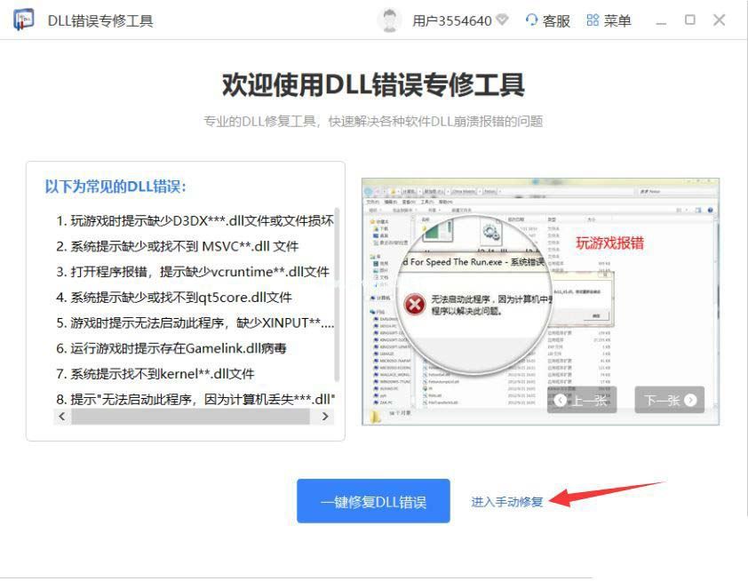当自动修复功能未能成功修复DLL报错时,请使用手动修复功能,搜索报错的DLL文件,然后点击手动修复。