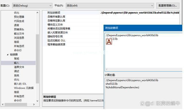 1. 打开项目属性对话框,选择“配置属性”>“链接器”>“输入”。