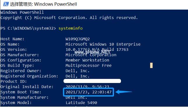 用和方法一同样的方法打开Windows PowerShell(管理员)(A),然后输入systeminfo后按下回车键,就可以看到系统启动时间。